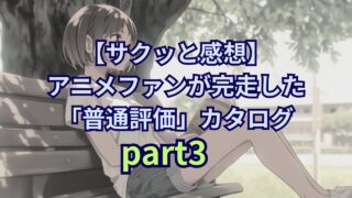 アニメ紹介【サクッと感想】アニメファンが完走した「普通評価」カタログpar3(15選) このシリーズも3回目。やっぱりあるんです、「悪くはないけど、2回目の視聴もない」アニメ!今回もジャンルは色々ですが、さくっと簡単に感想と評価を書いています。私には普通だったけど、あなたにとっては刺さる作品があるかもしれません。超簡単に読める... 2025.08.23アニメ紹介